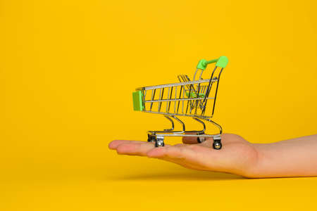 On a mans hand is a small empty metal trolley from a supermarket. The object is on a yellow background. Horizontal photo. trading concept