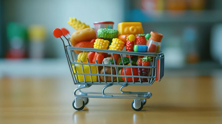 Mini shopping cart filled with tiny toy foods