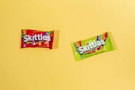 Tyumen, Russia-December 27, 2021: Original Skittles brand candies. Multicolored background. delicious sweet skittles