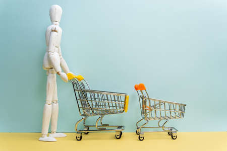 Shopping cart with wooden man mannequin shopping bags on blue background. Creative idea for online shopping, supermarket concept. copy space