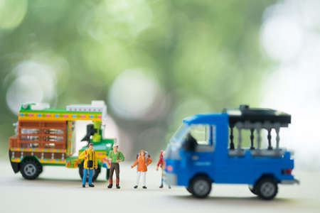 Close up miniature people waiting train at early morning rush hours, busy modern life concept. Thailand public transportation concept