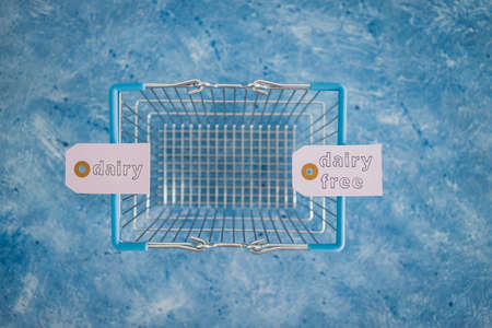 dairy vs dairy-free product tags with shopping basket, concept of plant-based food or allergies and nutritional choices