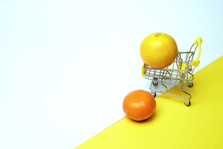 Grocery basket on wheels, minimalism. On light background. Online shopping. Grocery basket on wheels, minimalism. On light background. Online shopping. Citrus for health.