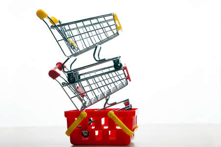 close-up of shopping trolley on gray concrete background with some copy space. Soft focus.