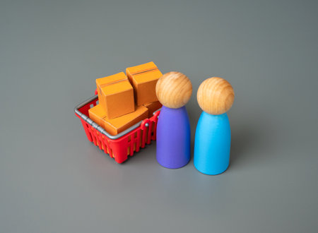 Shoppers and a shopping cart with boxes of goods. Customers buyers and their preferences. Demand in the market. Products and services. Marketing and advertising. Consumption and solvency.