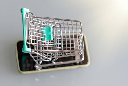 Oline shopping abstract. Shopping cart over the smartphone screen.