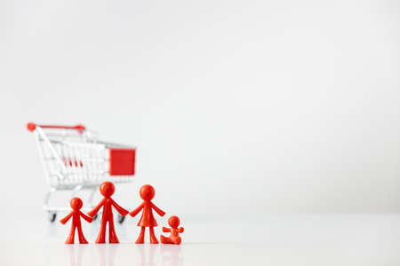 Miniature plastic figures family with children and Metallic shopping cart trolley on light gray background