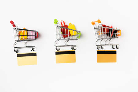 Top view of credit cards near shopping carts with toy gifts and bags on white background