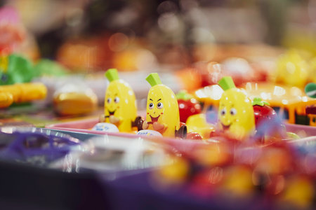 A banana fruit Toy with happy cartoon face,A yellow color scooter toy, children toys in yellow color selling in market, fair, mall, or store