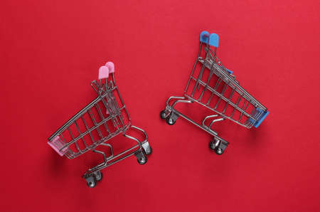 Two mini supermarket trolleys on red background. shopping concept. top view. minimalism