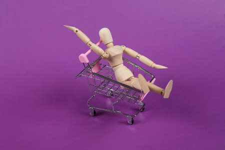 Wooden puppet in supermarket trolley on purple background. shopping concept