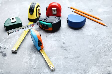 Background with tape measure on a blue background