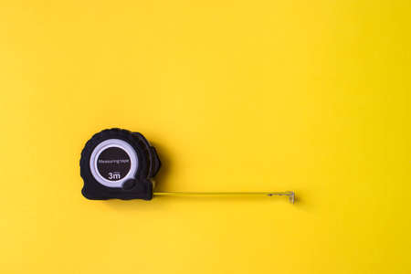 Tape measure on a yellow background. Top view. Minimalistic industrial concept