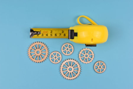 Yellow tape measure and six wooden gears on blue surface represent precision, measurement, and mechanical design in engineering or construction contexts.
