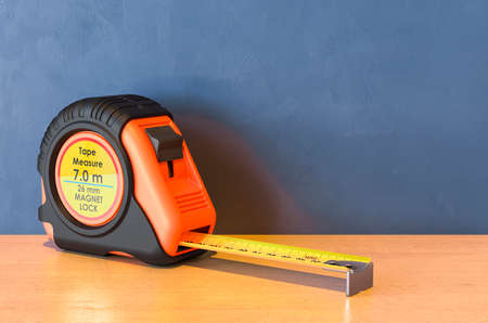 Tape Measure on the wooden table. 3D rendering