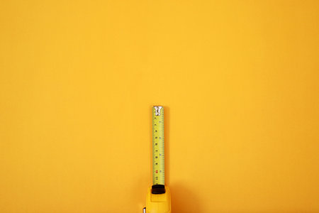 The yellow measuring tape for the mason is placed on a yellow background. Soft focus.