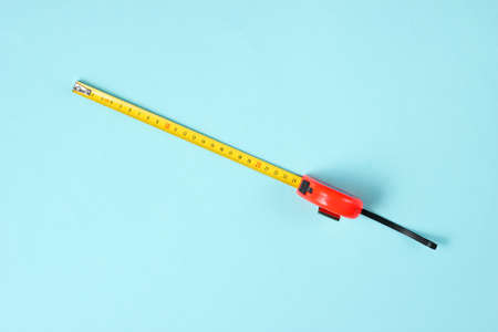 Tape measure on blue background. Top view. Minimalistic industrial concept