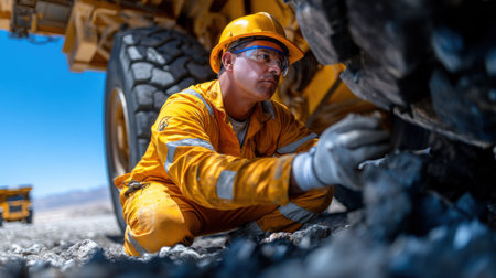 A man in a yellow outfit is working on a tire. Concept of hard work and dedication, as the man is bent over and focused on his task