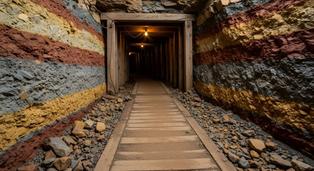 Deep within an abandoned mine, a narrow tunnel reveals the remnants of past labor. Haunting shadows dance on the rocky walls, while the soft glow of light breathes life into this forgotten space.