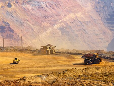 Yellow dump truck loading minerals copper, silver, gold, and other at mining quarry.