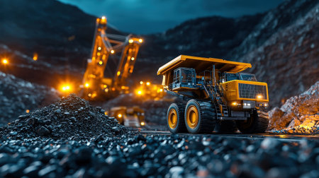 Large yellow mining truck in open pit coal mine quarry. Concept Mining Equipment, Heavy Machinery, Open-Pit Mining, Industrial Operations, Coal Mining