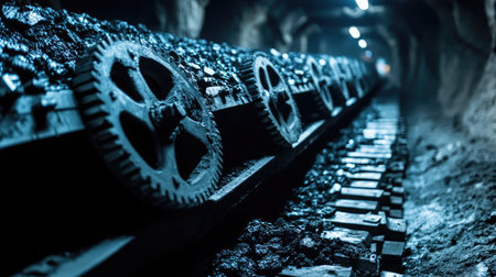 Mechanical conveyor gears in motion, hauling coal through a shadowy subterranean tunnel