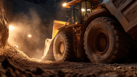 mining equipment and coal mining operation in twilight double exposure, created with generative ai