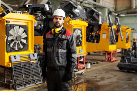 Young worker of modern factory in workwear standing against row of huge yellow industrial machines in warehouse