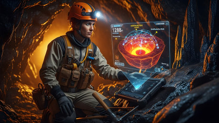 A woman in mining gear and helmet with headlamp examines a glowing holographic display showing...
