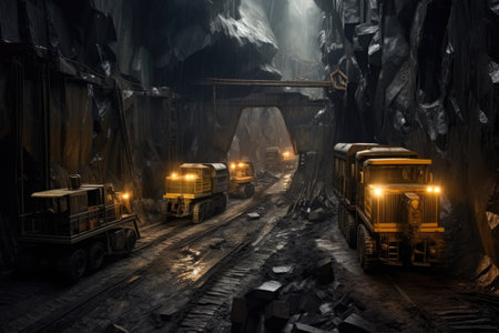 trucks and machinery working in a remote coal mine, created with generative ai