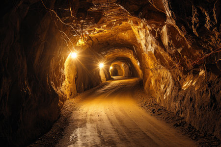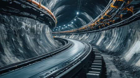 Dark underground mining tunnel with rail tracks illuminated by industrial lights. Mining industry concept