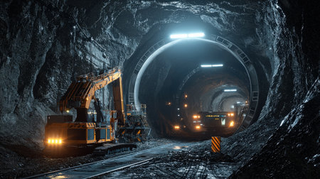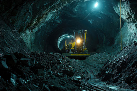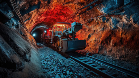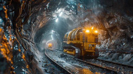 This striking image showcases powerful mining equipment operating in a dimly lit underground tunnel, highlighting the rugged rock formations and advanced technology.