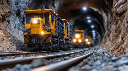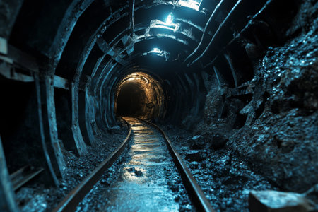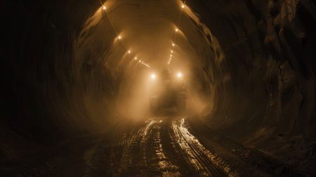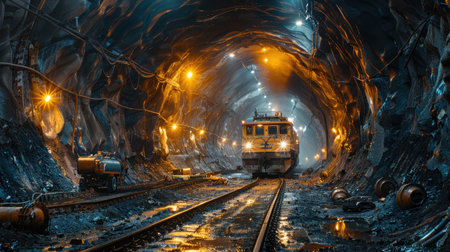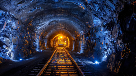 A captivating scene of a train entering a dark mine tunnel, illuminated by bright lights. The image showcases the contrast between light and shadow in an industrial setting.