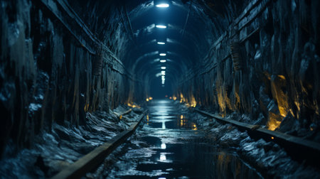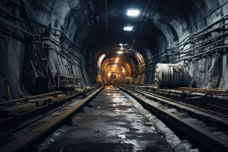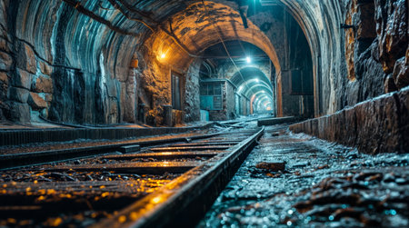 A captivating view of an underground tunnel with train tracks leading into the shadows. Dimly lit by artificial lights, this scene evokes mystery and exploration.
