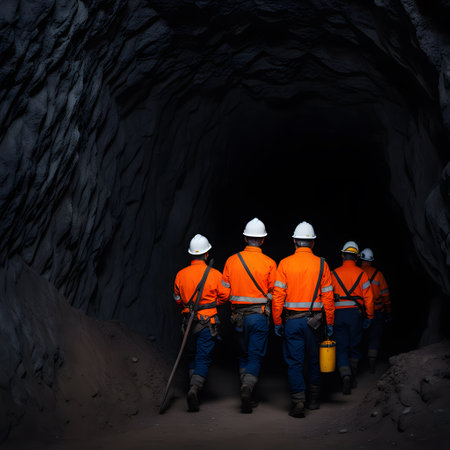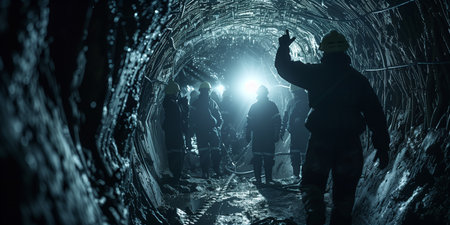 Mining team in a tunnel illuminated by headlamps, symbolizing unity and focused work in the depths.