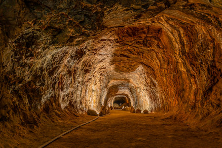 Underground rocksalt mine tunnel in Loulé, Algarve, with rugged mineral walls, industrial lighting, and overhead cables showcasing deep-earth mining infrastructure.