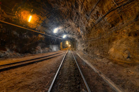 Coal mine underground ore tunnel with mining rails.