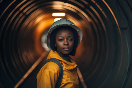 Portrait of african american woman in safety helmet and yellow jacket.
