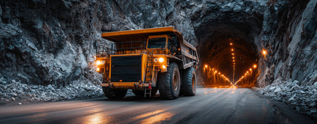 A large dump truck moves through a dimly lit underground tunnel, surrounded by rock walls. Bright lights illuminate the path, enhancing the rugged atmosphere of mining operations.