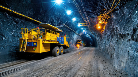 Underground mining tunnel illuminated by powerful industrial lights, with workers and heavy machinery extracting minerals.