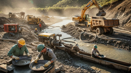 An outdoor scene depicts a mining operation with heavy machinery and workers actively engaged. The image shows a dynamic composition with earth-toned colors and natural light. Excavators and trucks are involved in resource extraction, while workers perform tasks. This imagery can be used for commercial projects related to industry, resources, or construction.