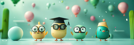 Happy easter. Cute cartoon chicks in eyeglasses and graduation cap. 3d rendering