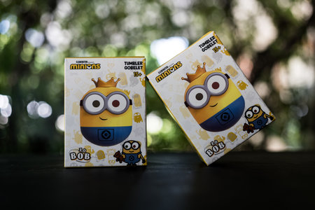 Bangkok, Thailand - October 27, 2023 : A Minions Random Box of tumbler Minions a collection of Minions BOB 1.0, randomly to 12 and secret 1 designs, sall in Miniso shop at Thailand