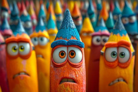 A group of Animated surprised pencils with eyes and mouth. 3d illustration.