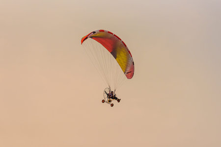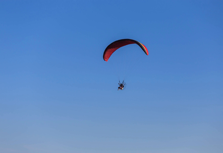 a red motorized paraglider in the blue sky flies with two passengers on a warm summer day. Flying sports.