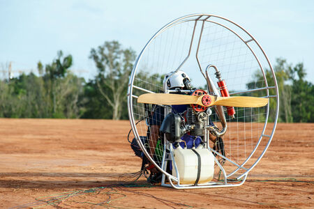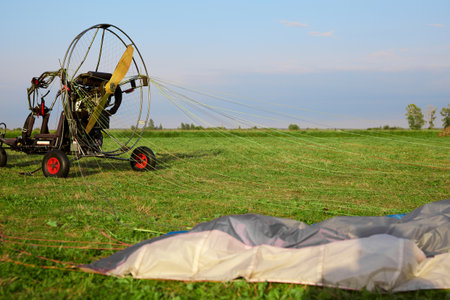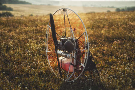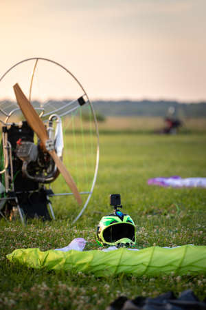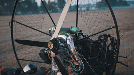 Lightweight motorized paraglider allows you to take off from any surface for flight enthusiasts. Close up of blades of paraglider engine, rope and parachute, neatly laid out in clearing before flight