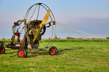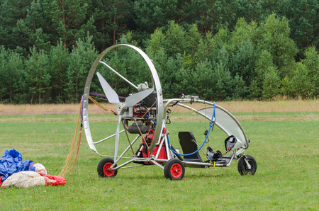 Powered paragliding vehicle on field with green grass, prepared for the flying