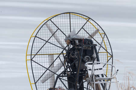 Closeup of a petrol-powered paramotor with a propeller and protection for individual paragliding flights.