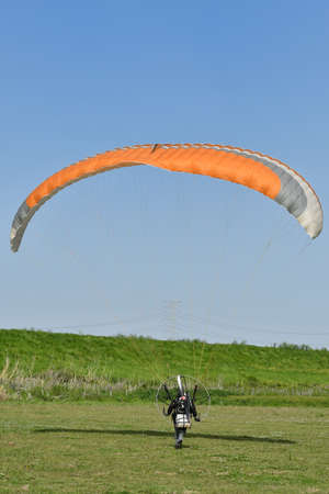 A pilot with a petrol powered backpack landed and folds the wing. Flying with a motorized wing. Extreme sports. Paralet and small aircraft.