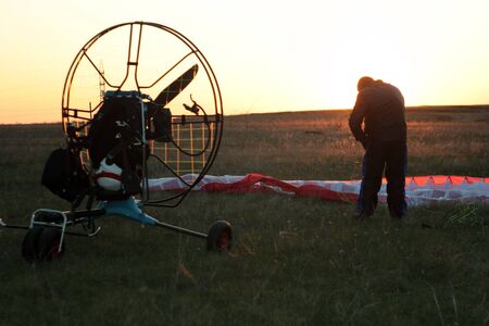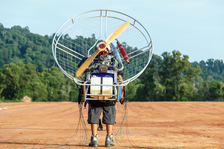 A male pilot is preparing a gasoline-powered paralet for flights. Paragliding for individual paragliding flights. Preparation for wing flight. Extreme sports.